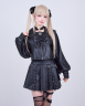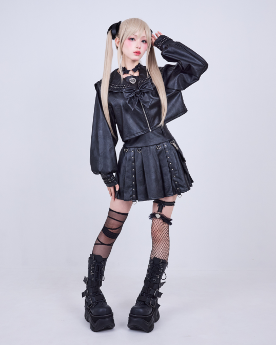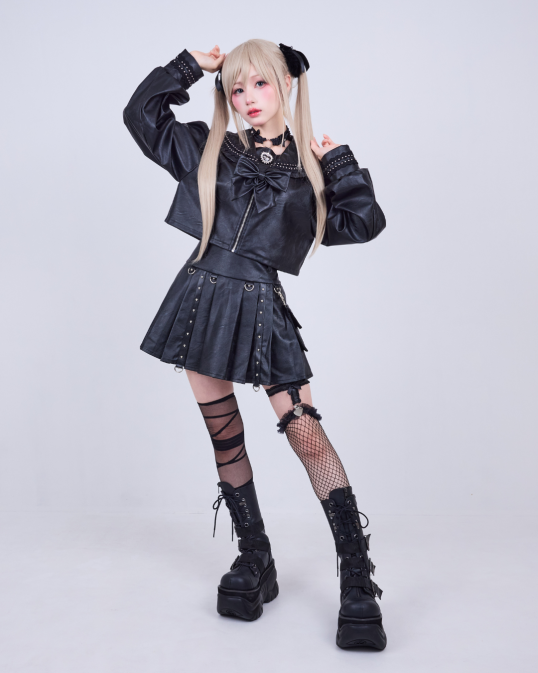 襟元に並んだスタッズと大きなリボン、胸元で輝くメタルチャームが