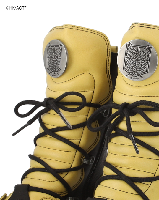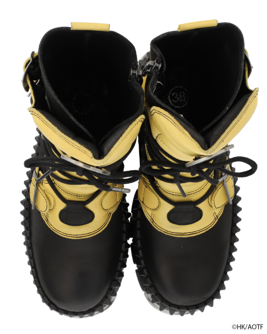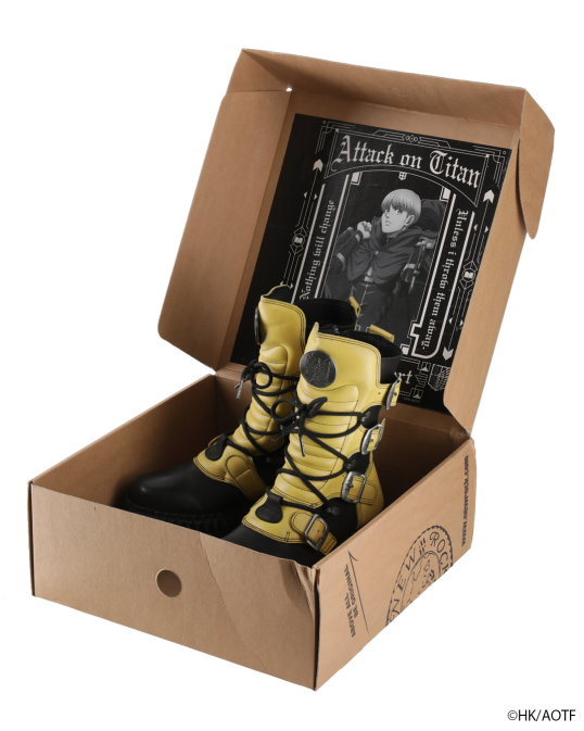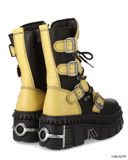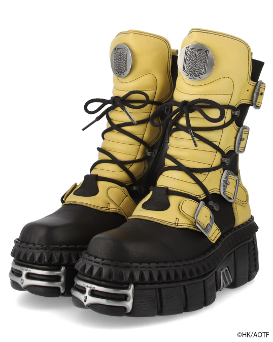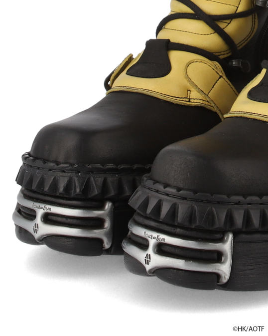 鮮やかなイエローのアルミンモデル。厚みのあるソールと金属パーツが放つ重厚な存在感は、NEW ROCKならではの仕上がり。アッパーにはエンブレムメタルパーツを配置し、力強くも精密な造形を実現。靴箱は進撃の巨人特別仕様。