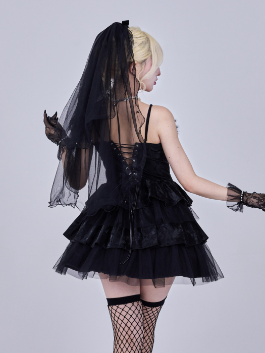 軽やかなチュールと光沢のある素材を重ねたボリュームフリルが、動くたびに華やかさをプラス。