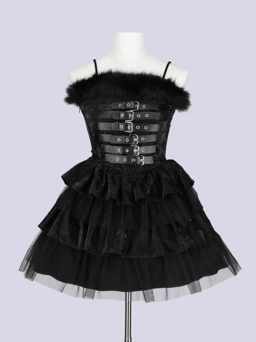 胸元にあしらったファーと、フロントに並ぶ多段ベルトが印象的なBelt Dress。