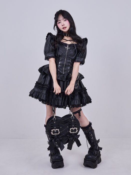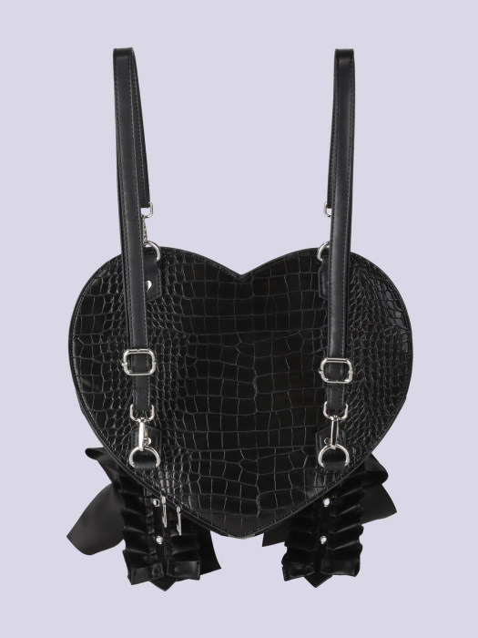 クロコ型押し素材とフリルディテールを組み合わせることで、